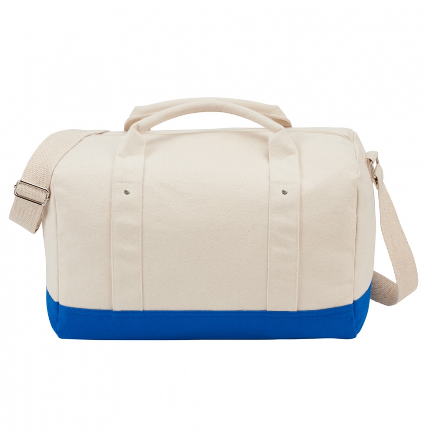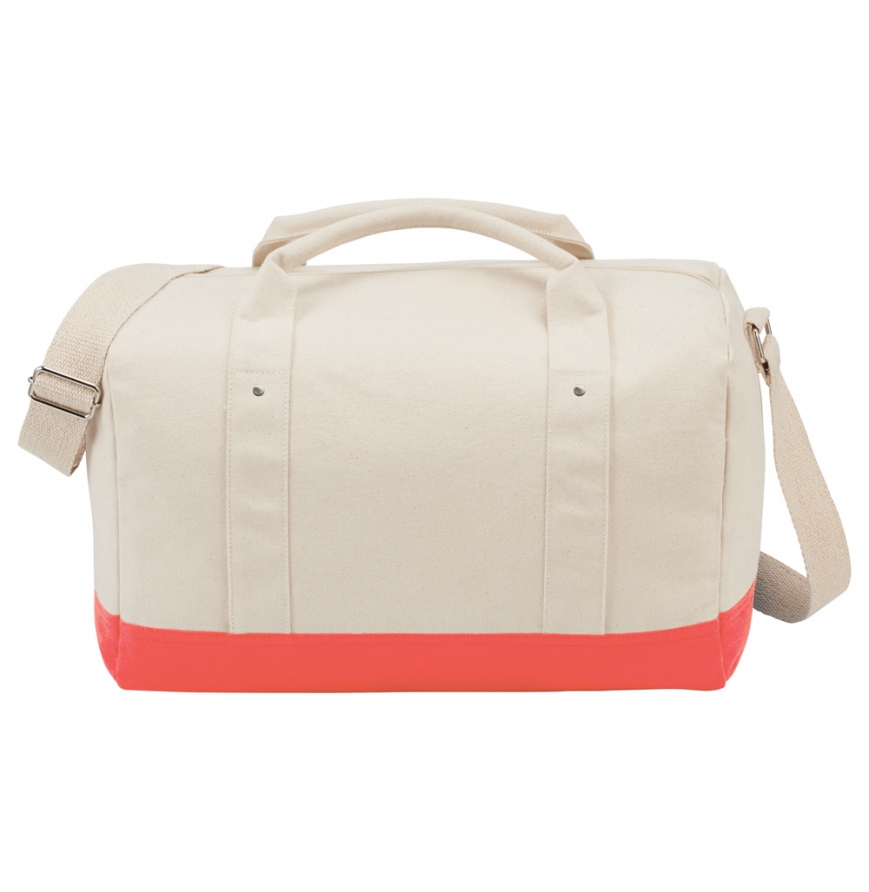 The Belair Cotton Canvas 17" Duffel shows off fun color-blocking and natural cotton canvas. This tote features zippered main compartment, cotton webbing shoulder strap and cotton grab handles. This duffel makes a great companion whether its a short weekend getaway or a trip to the gym.