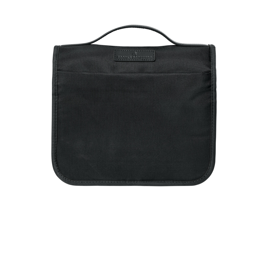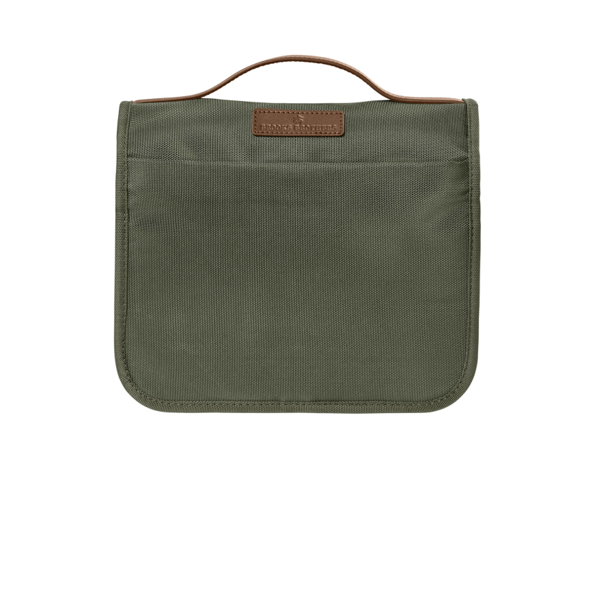 Perfectly compact, this is the ultimate hanging toiletry kit, ready for any travel itinerary. 500D x 750D polyester with knitted fabric backing 420D polyester lining Genuine leather trim and details Front zippered pocket for decoration access Magnetic snap closure on flap Foldaway metal hook on flap for hanging Two zippered mesh compartments on flap Zippered main compartment with interior elastic mesh slip pockets Leather top handle Leather zipper pulls with Brooks Brothers logo rivet Exterior debossed Brooks Brothers leather label Dimensions: 9 h x 9.75 w x 3.5 d Capacity: 305 cu. in./5 L Weight: .77 lbs./0.35 kg Note: Bags not intended for use by children 12 and under.