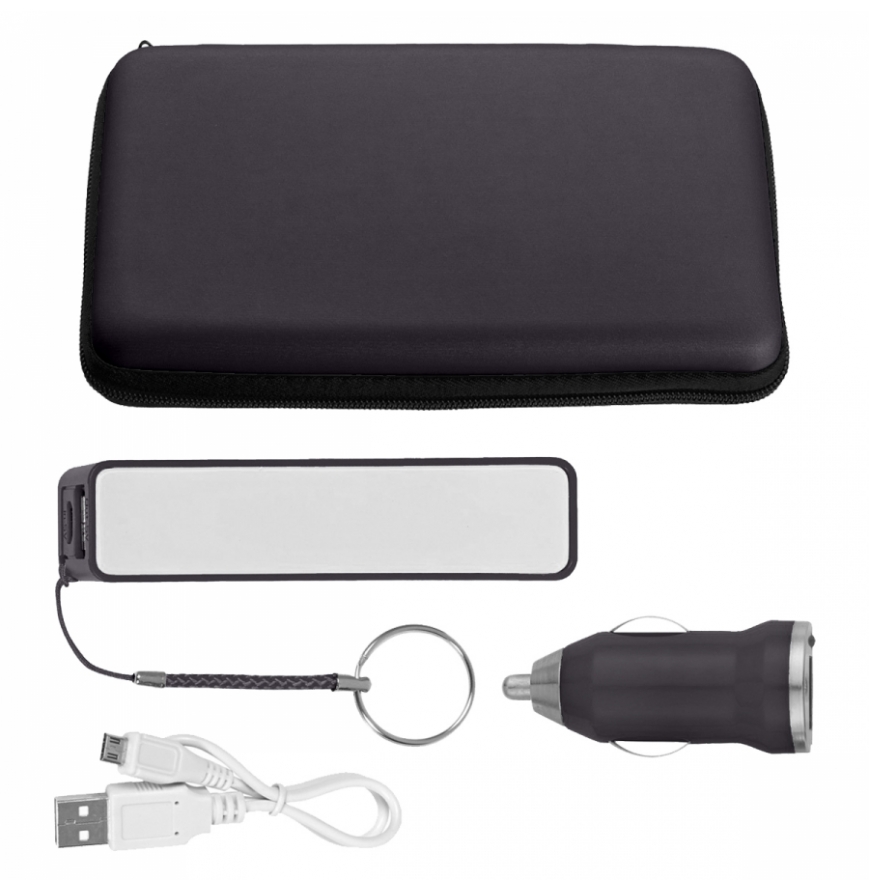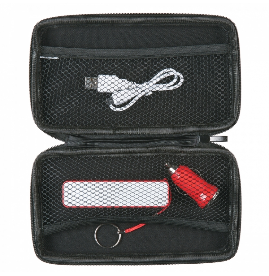 Includes Car Adapter And UL Listed 2200 mAh Portable Charger With Key Ring (UL File #MH60879, Model #2614), USB Output And Micro USB Input (Cord Included), Zippered Closure, 2 Interior Mesh Pockets, Perfect For Carrying Your Power Banks, Adapters, Cables and Audio Accessories While On The Go
