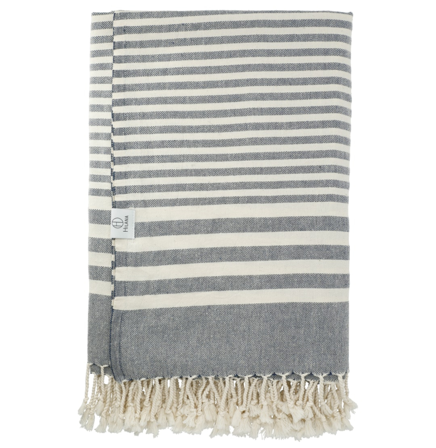 Pure joy made from recycled cotton! The Hilana Upcycled Fethiye Throw Blanket is the perfect size to share under the sun! With beautiful hand-knotted tassels, Hilana blankets are handcrafted according to ancient tradition. Theyre also made with 50% recycled cotton, making them softer and more durable. And the more you wash and use them, the softer they get! Hilana blankets fold down to a compact size, so you can throw them in your bag for the beach or the park. Fethiye blankets will dry you more quickly than with a regular towel, and they will dry faster too. Composition: 50% regenerated cotton + 50% natural cotton. Unfolded dimensions are 71" x 59". Through a partnership with 1% For The Planet, one percent of sales of all EcoSmart® products are donated to environmental nonprofits This blanket is spot clean only.