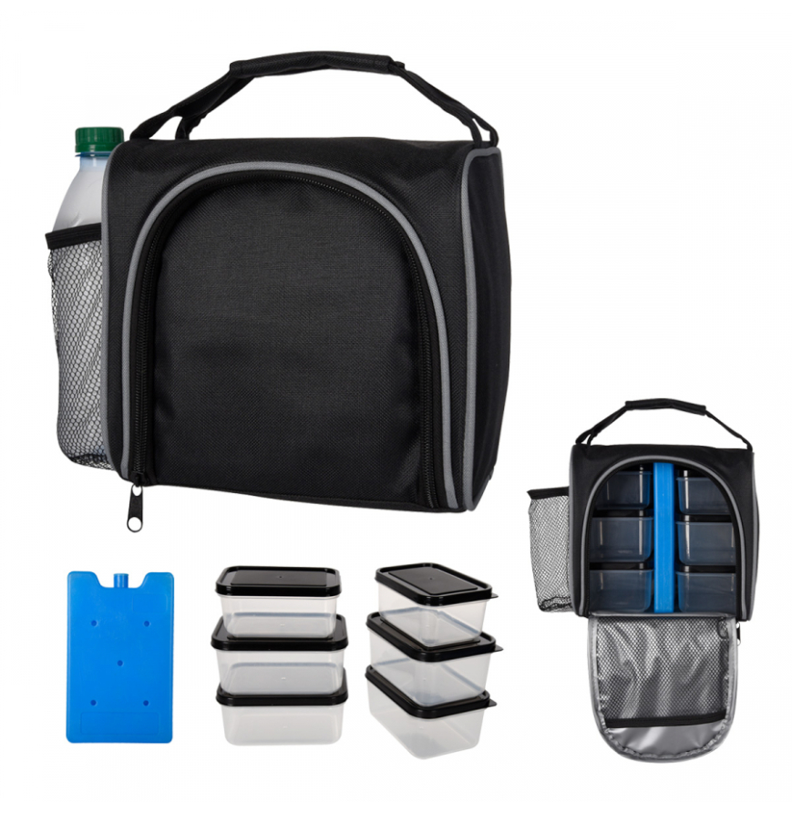 Made Of 600D Nylon , Gray PEVA Lining , Padded Carrying Handle , Zippered Main Compartment , Includes Six Storage Containers And Reusable Ice Pack , Side Mesh Pocket , Inside Mesh Pocket , Spot Clean/Air Dry , BPA Free , Meets FDA Requirements, Containers Hand Wash Recommended