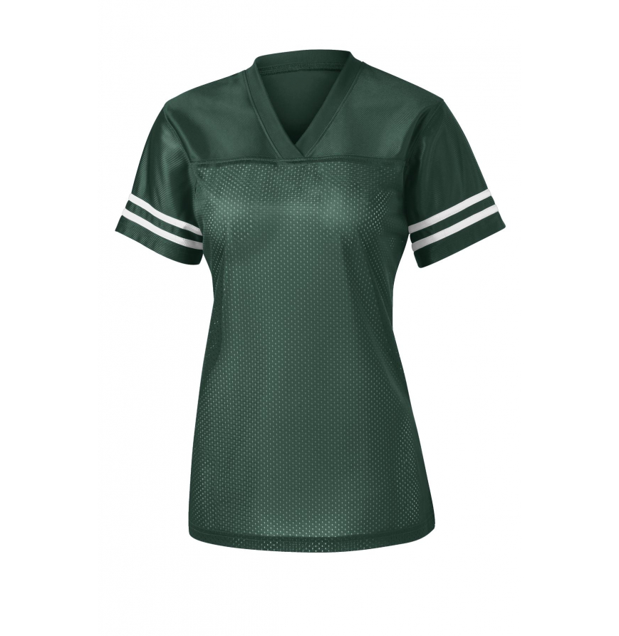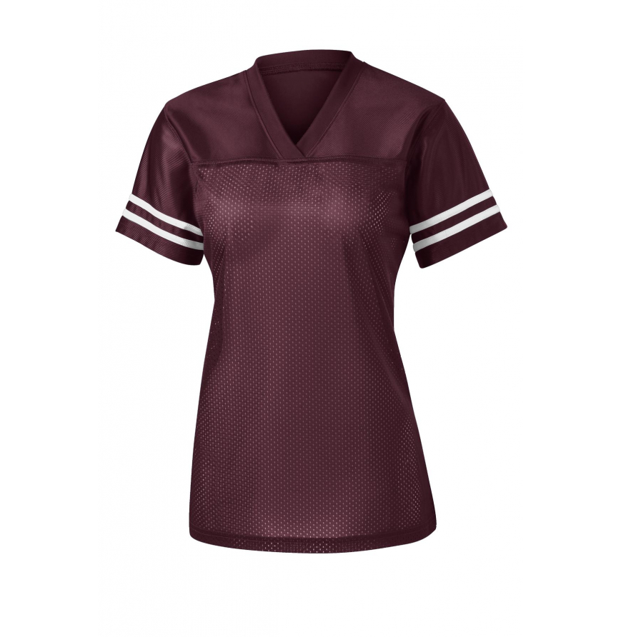 True athletic-looking jerseys featuring a breathable mesh body and color-locking PosiCharge technology. 3.6-ounce, 100% polyester mesh body with PosiCharge technology 4.1-ounce, 100% polyester dazzle yoke and sleeves with PosiCharge technology Removable tag for comfort and relabeling Crossover rib knit V-neck Set-in sleeves Sleeve stripes Not designed to be worn over pads
